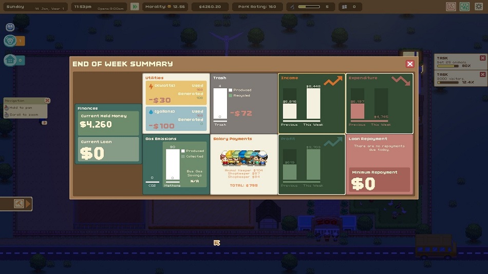 The interface itself also feels lacking in a larger sense. For example, to get a list of the Zoo’s staff, it’s unintuitively required to click on the entry gate, yet there is no obvious button that one would expect on screen to prompt it.