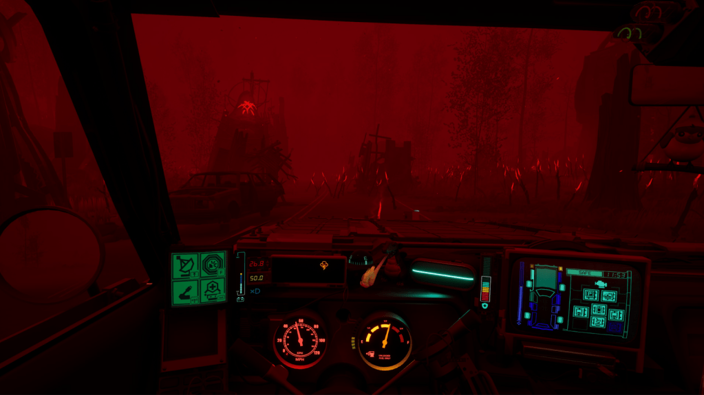 There are two new main systems to contend with. Instead of collecting energy to form an exit gateway as in the original Pacific Drive, the player now needs to collect a certain number of “artifacts” that will be sacrificed at an altar to open an escape route. These artifacts each have their own quirk that will apply to the player and their car, with the effects ranging from good to ‘get rid of this thing as fast as possible’. I do like the fact that the player can no longer tell where the level exit will appear. Previously the escape could be trivialized by plotting a clear route, now the player needs to adapt on the fly, leading to far tenser rides.