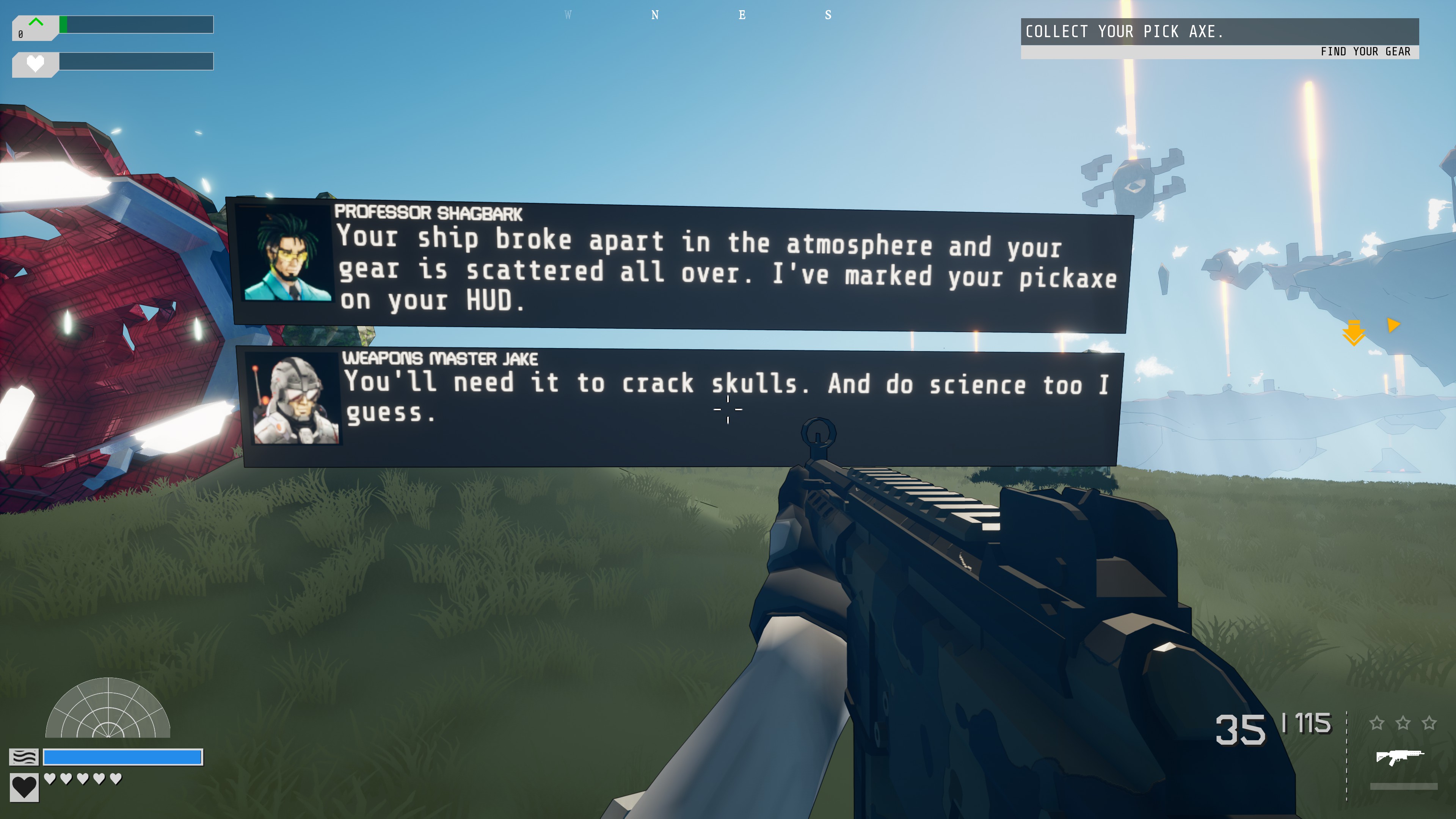 Upon starting, I wake up in some sort of crash pod and am swiftly informed that my mission is to “investigate the planet” and “kill bad guys. Thousands of bad guys”. Any narrative foundation is almost instantly forgotten as I step forward and grab my revolver. Echo Point Nova is not something to be played for the story, as what little story and lore is present mainly serves as a vehicle for the developer to bring the player up to speed and point them in the right direction. From there the map is revealed to be a sprawling setting of floating islands that almost all contain some sort of battle and reward.