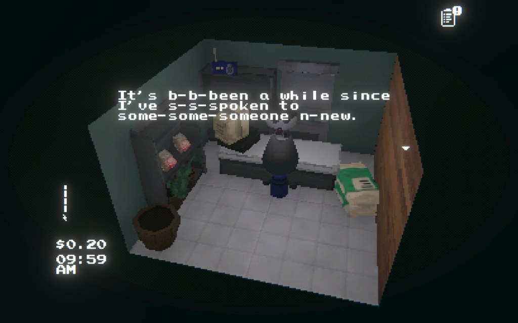The narrative is, for the most part, told indirectly through conversation with the denizens of Mountain Town and the surroundings hamlets. The player has one ally, MK. They’re apparently the only lucid character in the area, providing context for the proceedings and also acting as the primary quest giver. The townsfolk in Easy Delivery Co., seemingly confined to their storefronts, are generally standoffish. Some are downright hostile, but most just seem depressed and lonely as they reveal their neuroses and desires in casual conversation.