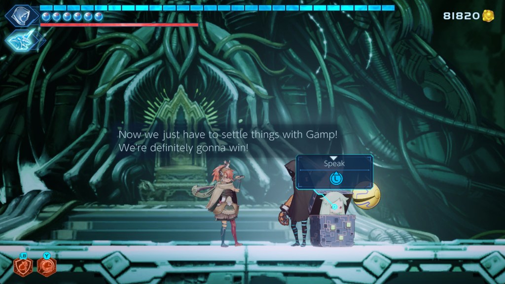 After that absurd opening, things get even stranger, as Puck and her player sidekick explore bizarre, shattered landscapes crammed full of biomechanical horrors. The player can fight back using fairly standard 2D side-scrolling combat. There are slash combos, dodges, parries, and an array of power moves that the player can obtain by killing bosses scattered around the world.