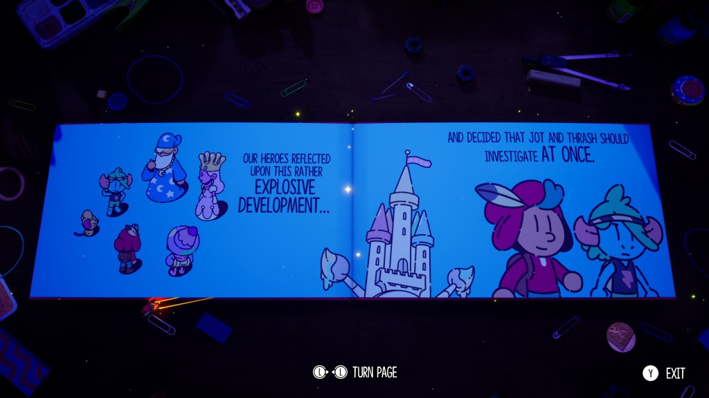 One mandatory quest involves bringing pigs — sorry, I mean “Rubboinks” — back to their pen. After each one is dropped off, the jovial farmer stops Jot to let him know that, hey, he just dropped off a Rubboink! When dealing with the aforementioned snails, Jot must gather two different volumes of a book, one on each side of the screen, all with running commentary from the surrounding snails. When the sequence is over there’s an unskippable, joyless “skit” scene where the snail actors do their little play.