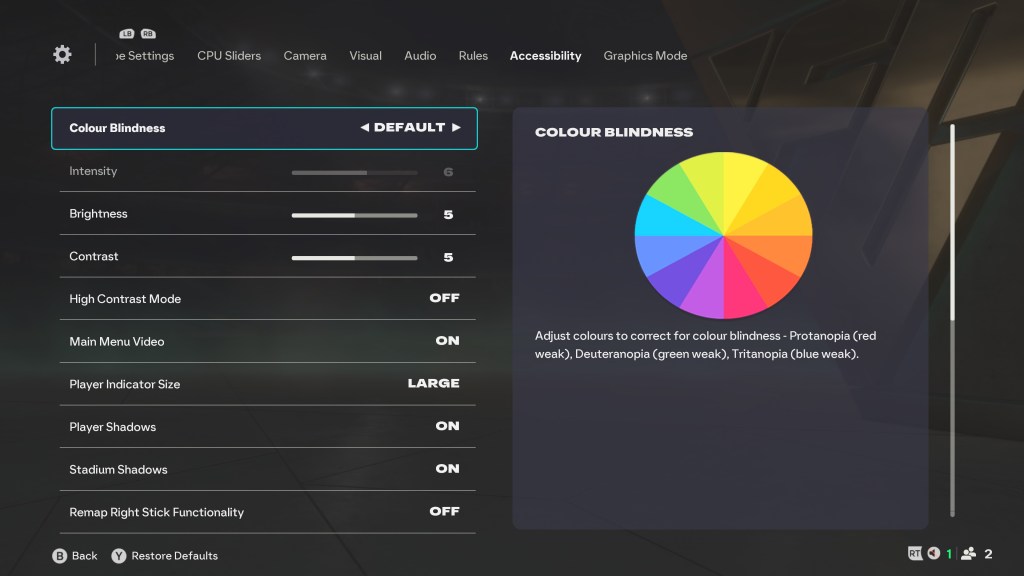 Colorblind Modes: Colorblind modes are available in the Game Settings menu.