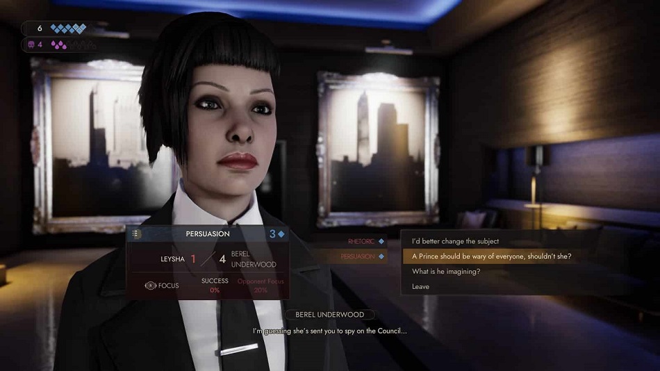 All of these abilities are regulated by Willpower and Hunger. Willpower is limited and can be spent to boost skills. It’s also key to Swansong‘s closest mechanic to actual combat — The Confrontation. These are basically battles in the form of dialogue trees. Emem might use willpower to boost her Persuasion skill to give her the upper hand in a tough negotiation, or Galeb might boost his Intimidate skill to force a suspicious cop not to challenge his authority. Even Disciplines can come into play, as they can block an opponent from boosting their own skills in a Confrontation.