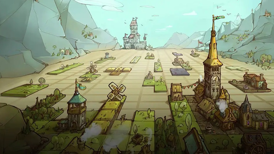 The tiles consist of various kinds of terrain and the buildings that interact with them. For instance, a Farm transforms surrounding Plains tiles into Fields, giving a bonus to a Watchtower that gains more units from the latter terrain type. As enemy buildings drop too, arranging tetrominoes so that the terrain benefits the player and not the enemy is a key strategic goal.