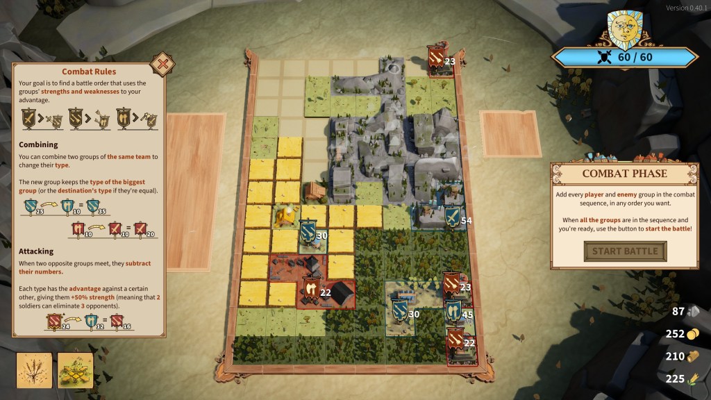 Sometimes a roguelike can pull a player back in with aesthetic components, but Drop Duchy doesn’t really offer anything compelling. The terrain is largely dull, though at least the mountain tiles vary entertainingly. The buildings are nicely drawn but not especially memorable and they don’t do anything interesting like change based on faction or upgrade level. The music is fine, but there’s just not enough character in the graphical design to make that next run feel necessary, and no story to speak of.