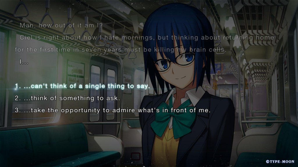 The only wrinkle in this otherwise perfect remake story is that A piece of blue glass moon is just the first entry of the Tsukihime remake project. The two routes contained in this release are just the “Near Side” routes. The original game’s three other “Far Side” routes — routes that were more psychodrama-focused and starred supporting characters like Akiha, Kohaku, and Hisui, are due to be included in another installment, Tsukihime -The other side of red garden-, which is still in production. This isn’t to say that the experience feels incomplete without the additional routes, but it’s an acknowledgement that those who want to know more about certain other characters and see how Type-Moon will address their respective stories may end up waiting a while for the second half of the remake project to release.