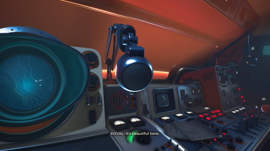 Need to navigate? Yasna will open up her log, turning the pages to represent different sectors on the map grid. Need to find landmarks to pinpoint a landing zone for the mother ship’s evacuation capsule? Yasna’s telescope has separate “dials” for distance and zoom. Notes and waymarkers appear marked in bright yellow pencil on the map. All of this is couched in a sublimely appealing retro-futuristic visual style inspired by the Cold War-era space race art and concepts from the Soviet side of the divide. There’s a chunky, weighty physicality to every object and animation that matches or exceeds even the likes of triple-A behemoths like Cyberpunk 2077 in making a player feel like they’re inhabiting the viewpoint character. If you’re like me and love to look at vintage appliances or appreciate consoles covered in old LEDs and switches, knobs, and dials, The Invincible‘s chunky, grounded aesthetic sense is as intoxicating as catnip.