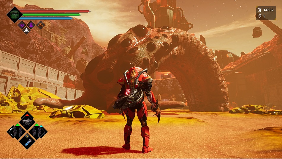 Dolmen also includes a weapon and suit construction mechanic with customizable options which would be an entertaining diversion if it wasn’t for the unworkable menus in which it is hard to tell what is highlighted. Also, some weapons and armor are gated behind grind that requires bosses to be beaten three times before the player can get the parts needed for successful crafting.