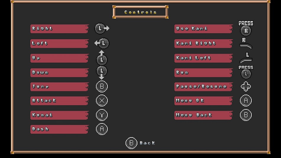 Remappable Controls: The game is controlled by moving the character around with the D-pad, using B to jump, A to slash and Y to throw kunai daggers (see included scheme). It is not possible to remap the controls.