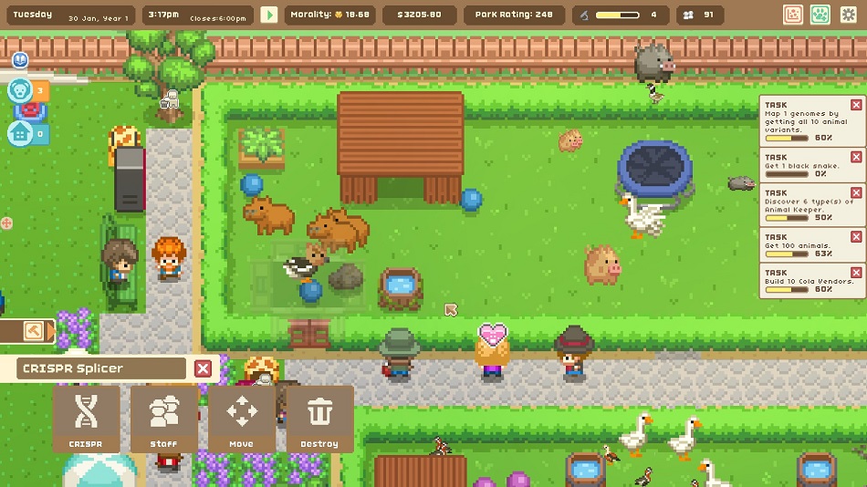 Aside from small quibbles like this, everything else about Let’s Build a Zoo works great and the pacing is well done. It’s easy to get lost in the larger mechanics of getting animals and putting down shops, and just as easy to dip into smaller things like regulating the amount of salt to put in the chips or sugar in the cotton candy. There are many fine details as well, like every animal having its own name, seeing VIPs visiting the zoo, and there’s even DNA splicing to create the perfect hybrid between any two animals to really draw the crowds. A pig/snake (pigake?) combo, anyone?
