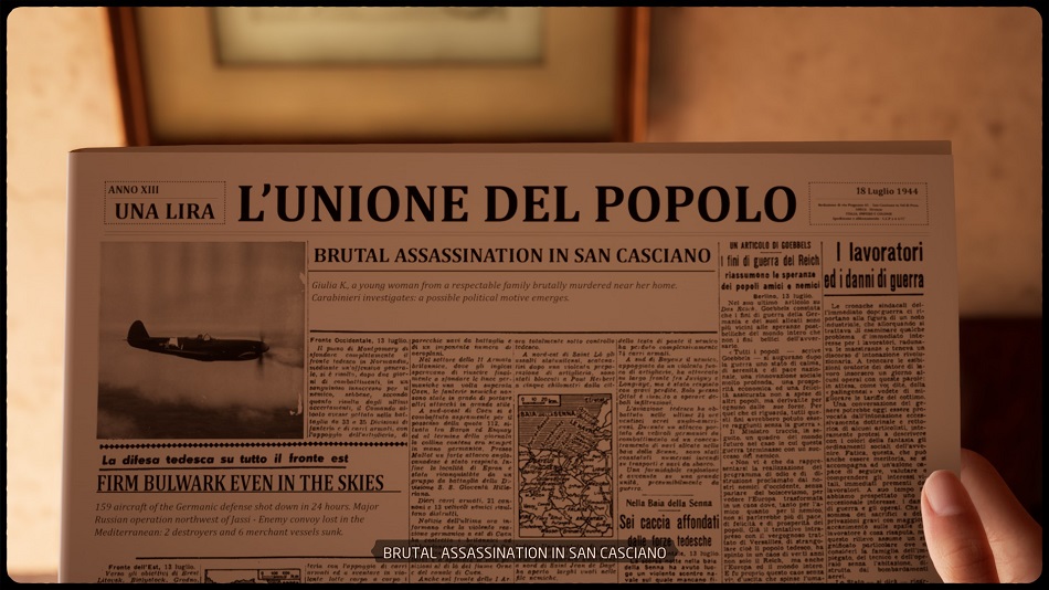 On Steam, the developers list “unashamedly authentic voice acting in Italian”. Well, I don’t know what they mean by authentic exactly, but I played with English subs on and couldn’t help but notice something strange. The subs would say different things than the voiceovers, and the discrepancies couldn’t be easily explained as slight differences in translation. I’m really not sure if I should have followed the story told in the subtitles or the one in the voice acting. There’s more language confusion elsewhere — if one reads a newspaper, half is in Italian and the other half in English. This jumble makes for Tower of Babel-like confusion.