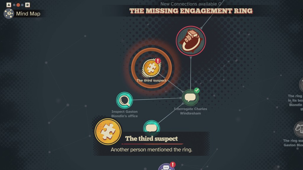Throughout Nile’s chapters, I also had to diligently inspect 3D pieces of evidence before spending hours within the main characters’ “mind maps” (accessible via menu) where all hard-earned deductions are stored and comprehensively arranged. Then, I had to carefully connect the scattered info into rock-solid conclusions that rose above all of the obfuscating layers smothering the truth.