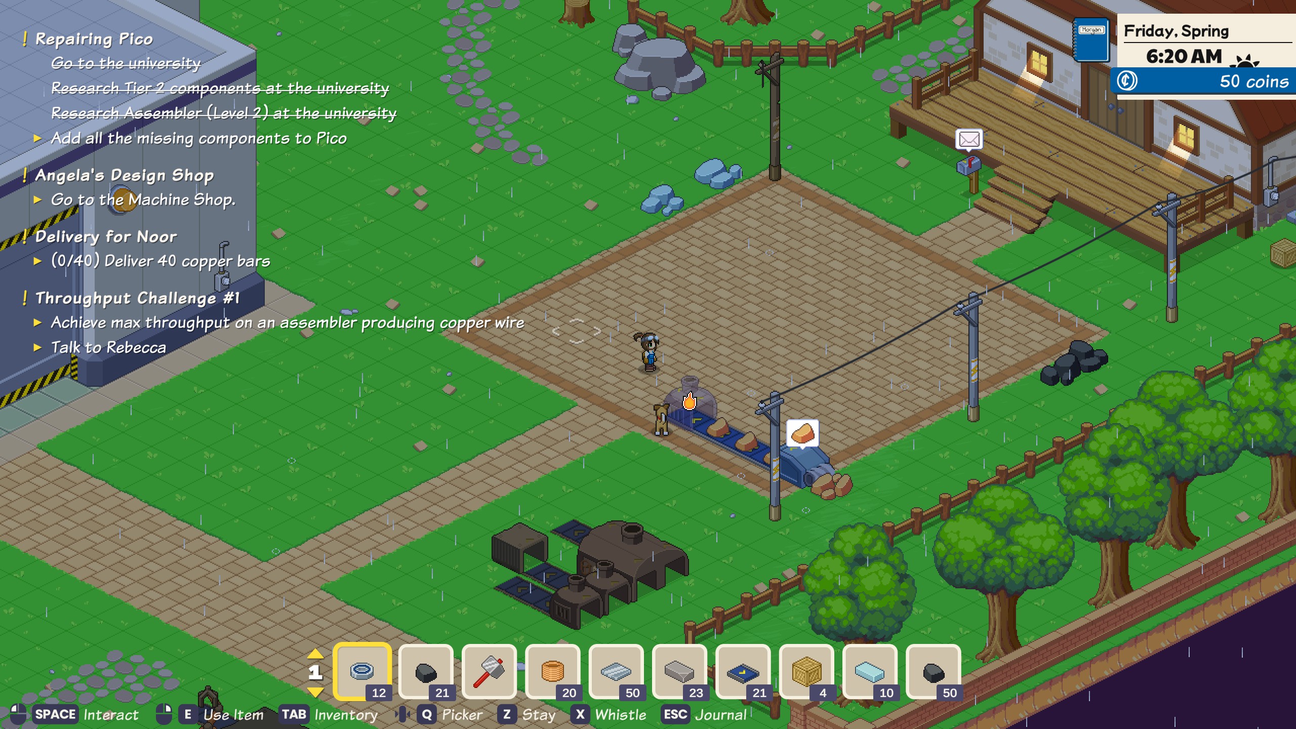 The UI, while okay, is not as full-featured or intuitive as it should be. More annoyingly, players can only save by going to sleep at the end of each in-game day – not cool. Time ticks away at a Stardew-like clip, which is not 1:1 with real life time or anything, but it does mean that the minimum play session will be about 20 minutes long, and any unforeseen interruptions can mean losing progress – and progress in a factory builder is everything. Frankly this Save-Only-When-You-End-The-Day system is annoying in any life sim, and I think it is a genre legacy mechanic that the devs brought over without scrutiny. They have said they’ll be taking a look at this system in future patches, but as of the time of writing, it’s still an issue.