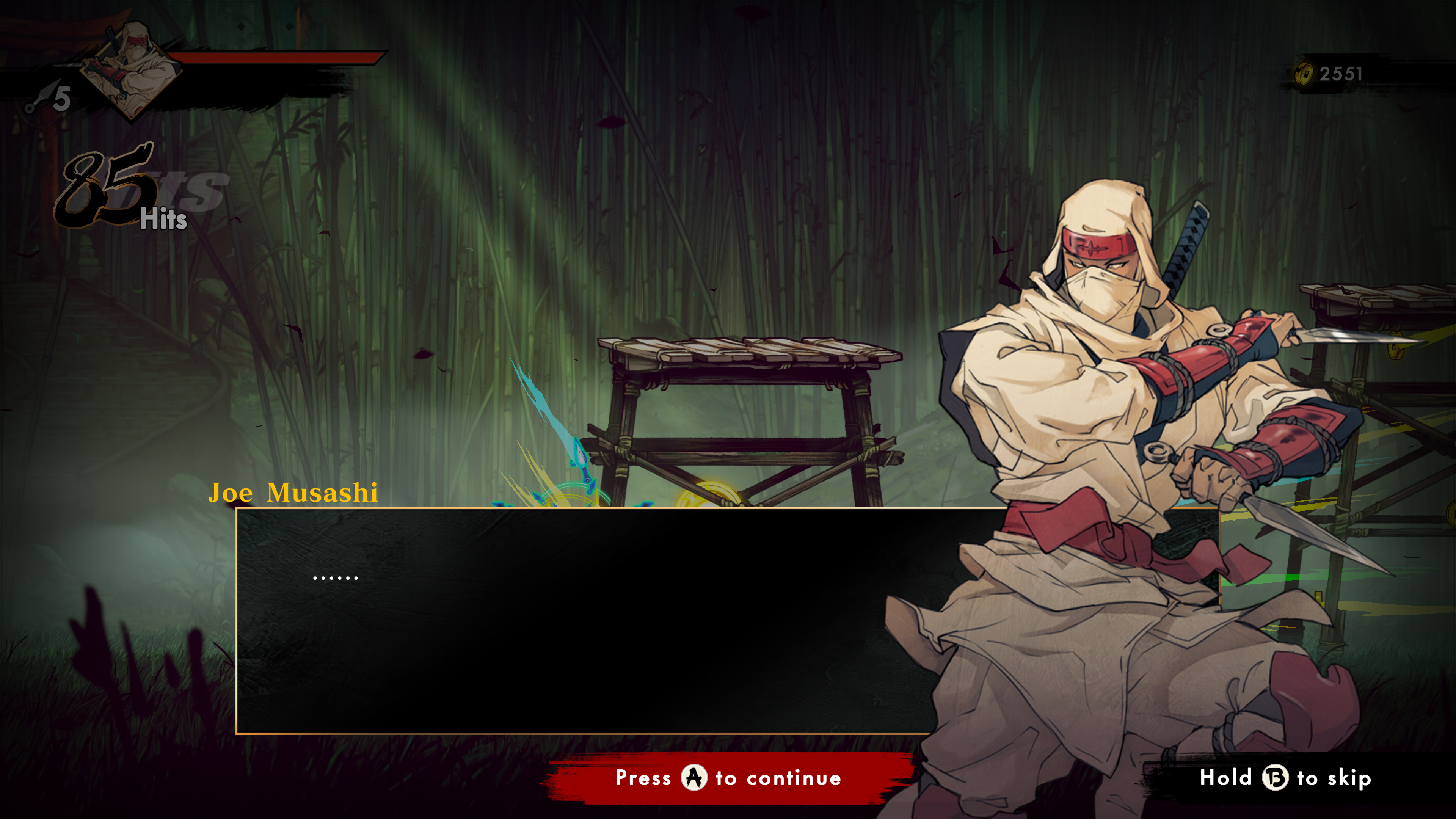 Players will rely on Joe’s trusty katana during this 2D side scrolling quest, as well as a pocket full of throwing knives and an understated ability to dive-kick dudes in the face. Over time he’ll acquire new moves and additional gear, but don’t expect new weapon types. Blowing fire and summoning snake gods are all well and good, but Joe’s ultimately a katana guy through and through.