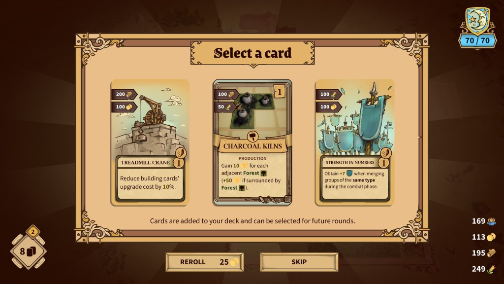 Unfortunately, unlocking new elements didn’t always feel like progress. Gaining the river terrain complicates the earlier parts of the run with few benefits. Most cards interacting with this terrain are not strong and are entirely ineffective if there are less than 15 contiguous river tiles, making them high-risk, mid-reward selections.