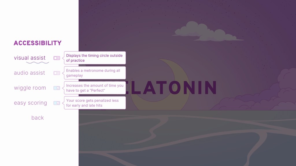 Melatonin also has assists that may help players with poor timing or those with disabilities. These can consist of adding a metronome beat, or permanently turning on the tutorial-style button prompts, which makes Melatonin a more “traditional” rhythm experience. Personally, I found the scoring assists which widens the “perfect” timing window to be the most helpful. Melatonin doesn’t penalize one for turning on assists either, which I appreciate as someone who was never a fan of the way some devs try to shame players who want to take it easy.