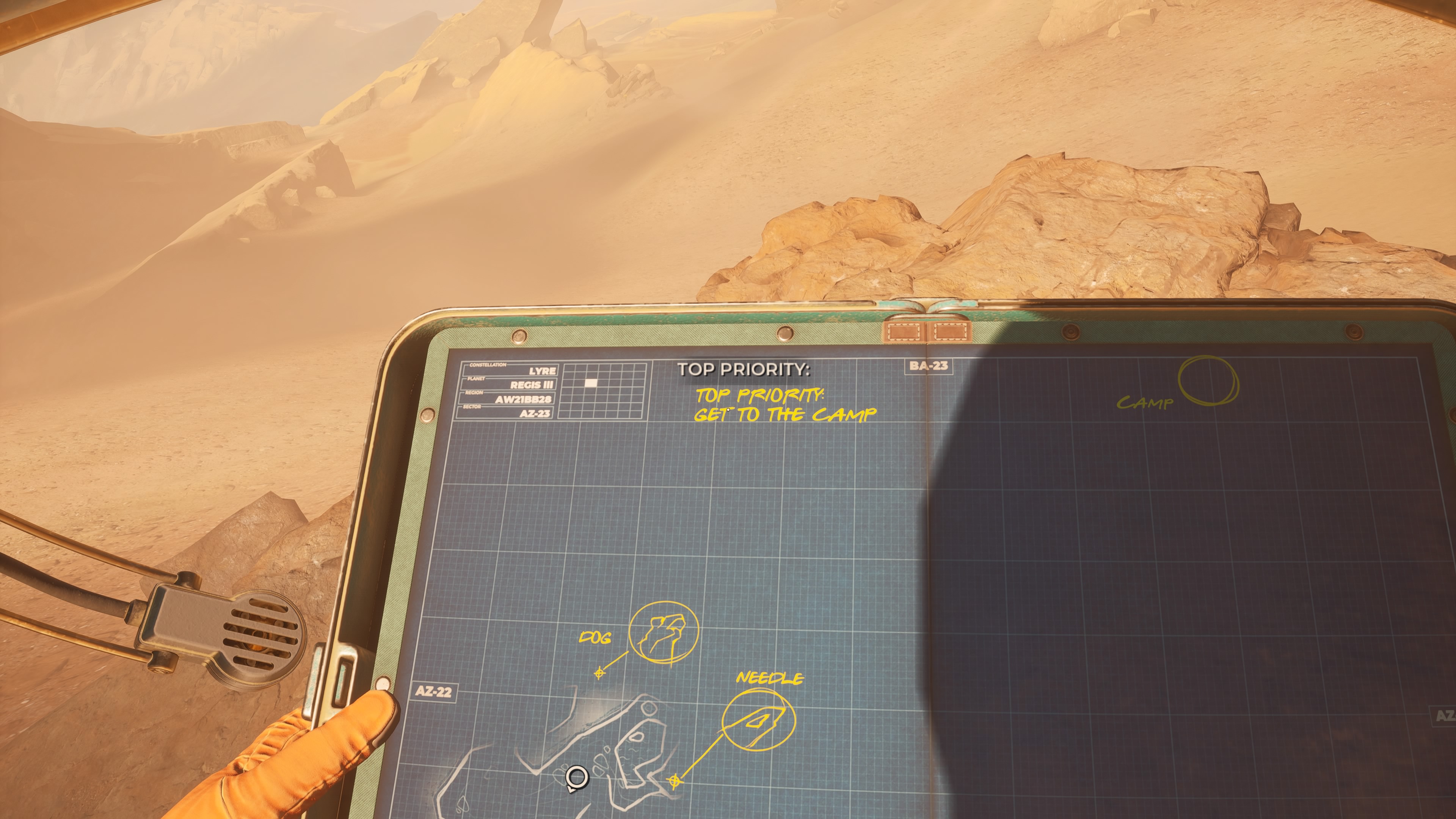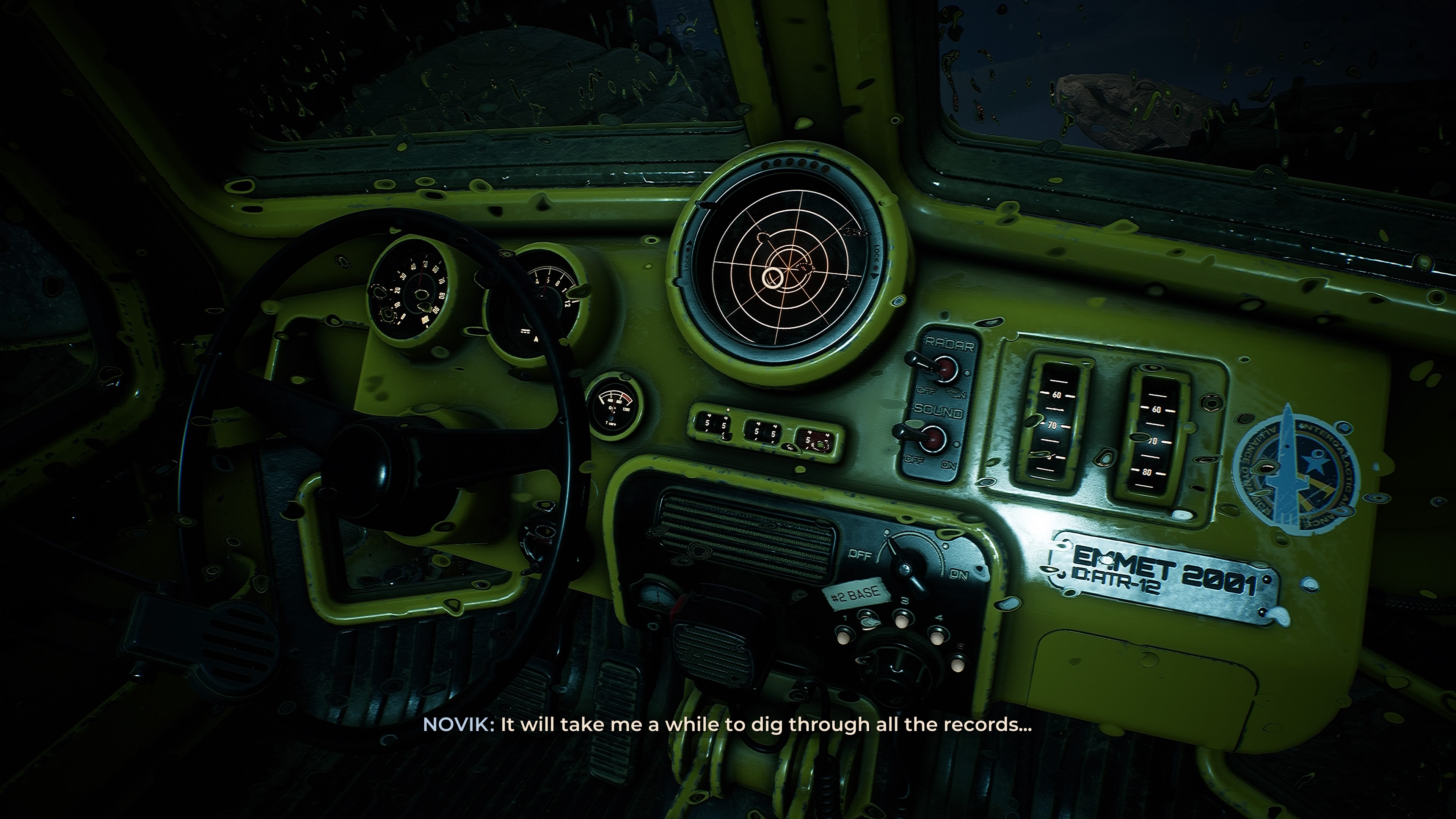 Need to navigate? Yasna will open up her log, turning the pages to represent different sectors on the map grid. Need to find landmarks to pinpoint a landing zone for the mother ship’s evacuation capsule? Yasna’s telescope has separate “dials” for distance and zoom. Notes and waymarkers appear marked in bright yellow pencil on the map. All of this is couched in a sublimely appealing retro-futuristic visual style inspired by the Cold War-era space race art and concepts from the Soviet side of the divide. There’s a chunky, weighty physicality to every object and animation that matches or exceeds even the likes of triple-A behemoths like Cyberpunk 2077 in making a player feel like they’re inhabiting the viewpoint character. If you’re like me and love to look at vintage appliances or appreciate consoles covered in old LEDs and switches, knobs, and dials, The Invincible‘s chunky, grounded aesthetic sense is as intoxicating as catnip.