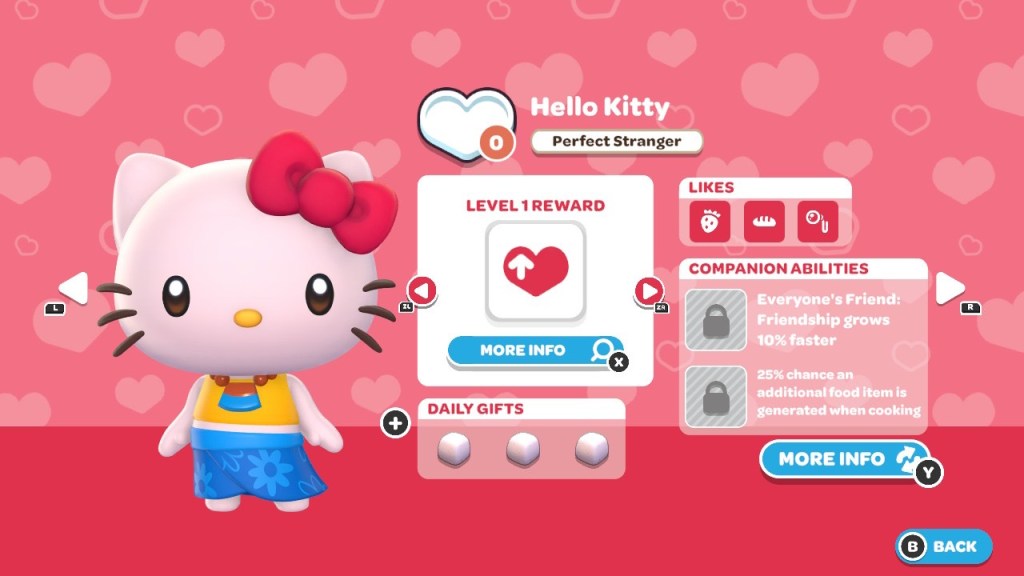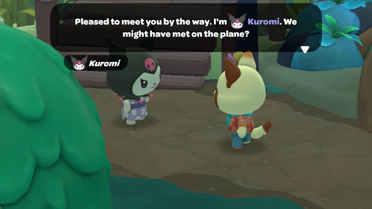 Talking to them introduces players to the concept of leveling up their friendship, which is achieved by completing quests with specific characters or giving them gifts. The latter part of that process is one of the most prevalent aspects of play, as players can give NPCs items from their inventories. Everyone on the island has interests such as sweets or items for crafting. For example, Hello Kitty loves and will accept pineapples from the player.
