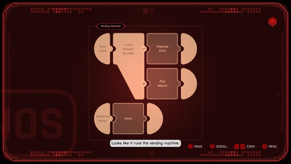 While the initial sequence does hint at classic graphical adventure mechanics — find items, talk to characters, solve puzzles — the rest of the experience follows a new blueprint. At the end of the first scene, a character gives Robert a hacking tool, and most of the puzzles that follow will involve interacting with that tool in order to modify the behavior of various systems we find. For example, making a robot act erratically to distract a guard, or swapping the ‘close’ and ‘open’ functions of a door.